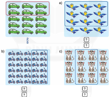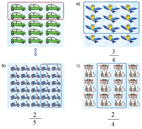 Quan sát hình vẽ rồi viết phân số chỉ số con vật được khoanh trong mỗi hình.