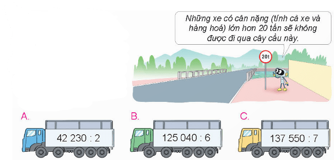 Kết quả của phép tính ghi trên mỗi xe là tổng cân nặng (tính theo đơn vị ki-lô-gam) của xe và hàng hoá trên chiếc xe đó. Hỏi chiếc xe nào có thể đi qua cây cầu?