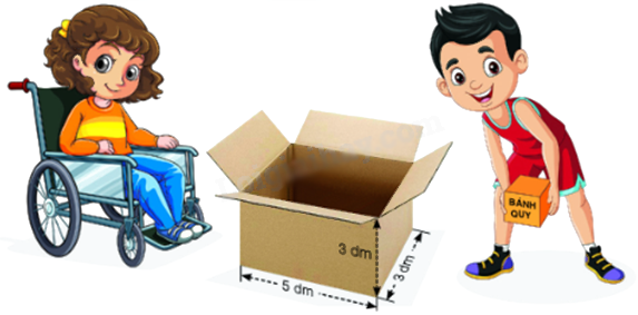 Huy giúp mẹ xếp bánh vào một thùng đựng hàng dạng hình hộp chữ nhật như hình dưới đây. Có thể xếp được bao nhiêu hộp bánh dạng hình lập phương cạnh dài 1 dm cho đầy thùng?