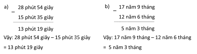 - Nếu số đo theo đơn vị nào đó ở số bị trừ bé hơn số đo tương ứng ở số trừ thì cần chuyển đổi 1 đơn vị hàng lớn hơn liền kề sang đơn vị nhỏ hơn rồi thực hiện phép trừ như bình thường.