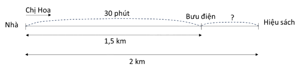 Câu 4. Quãng đường từ nhà chị Hoa qua bưu điện đến hiệu sách dài 2 km. Chị Hoa đi từ nhà đến bưu điện hết 30 phút. Hỏi với vận tốc đi như thế, chị Hoa phải đi thêm bao nhiêu phút nữa để đến hiệu sách? Biết quãng đường từ nhà đến bưu điện dài 1,5 km.