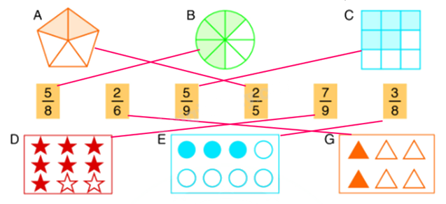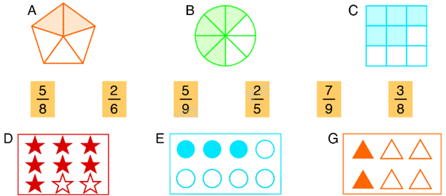 Quan sát hình vẽ để viết phân số tương ứng của mỗi hình.