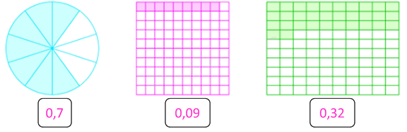 Quan sát hình, đếm số phần đã tô màu để viết số thập phân thích hợp.