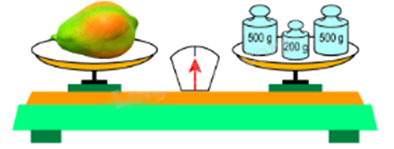 Do cân thăng bằng nên cân nặng của quả đu đủ bằng tổng cân nặng của các quả cân trên đĩa bên phải.