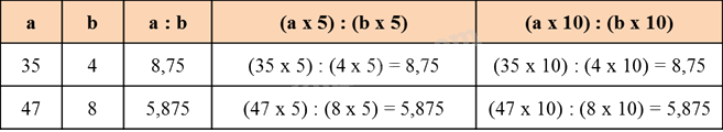 Ta thấy giá trị biểu thức a : b; (a × 5) : (b × 5) và (a × 10) : (b × 10) luôn bằng nhau.