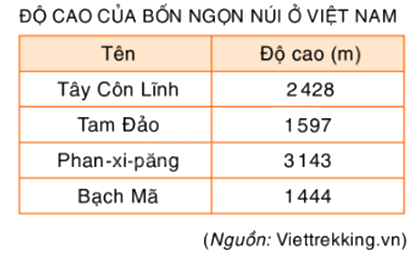 Vậy tên các ngọn núi theo thứ tự độ cao tăng dần là: Bạch Mã; Tam Đảo; Tây Côn Lĩnh; Phan-xi-păng.