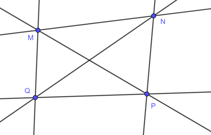 Từ các cặp điểm vừa chọn, vẽ các đường thẳng đi qua các điểm đó. Ta có 6 đường thẳng: MN, MP, MQ, NP, NQ, PQ (như hình vẽ).