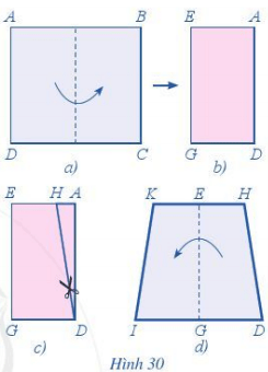 a) Gấp miếng bìa có dạng hình chữ nhật ABCD sao cho đỉnh A trùng với đỉnh B; đỉnh D trùng với đỉnh C (Xem Hình 30a).