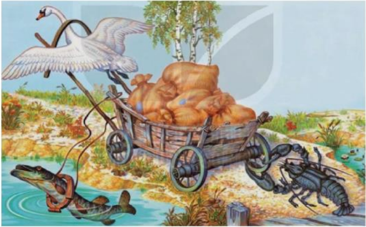 Văn bản mượn truyện loài vật để nói bóng gió về câu chuyện loài vật: cá măng, tôm hùm, thiên nga cùng nhau kéo xe hàng, nhưng vì mỗi con vật đều kéo xe theo một hướng khác nhau nên xe vẫn không thể dịch chuyển. Câu chuyện nhằm truyền tải thông điệp: trong mọi việc cần thống nhất ý kiến, đồng thuận với nhau mới dễ thành công.
