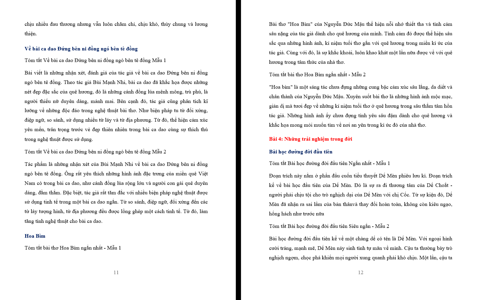 Bộ tài liệu dài 33 trang, gồm các đoạn văn tóm tắt ngắn gọn và đầy đủ của 40 văn bản thuộc 10 chủ đề trong chương trình Ngữ văn lớp 6 sách Chân trời sáng tạo. Mời các em học sinh tham khảo.