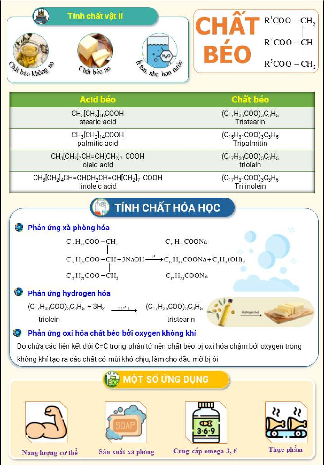 - Về cấu tạo, chất béo thuộc loại hợp chất ester ba chức.