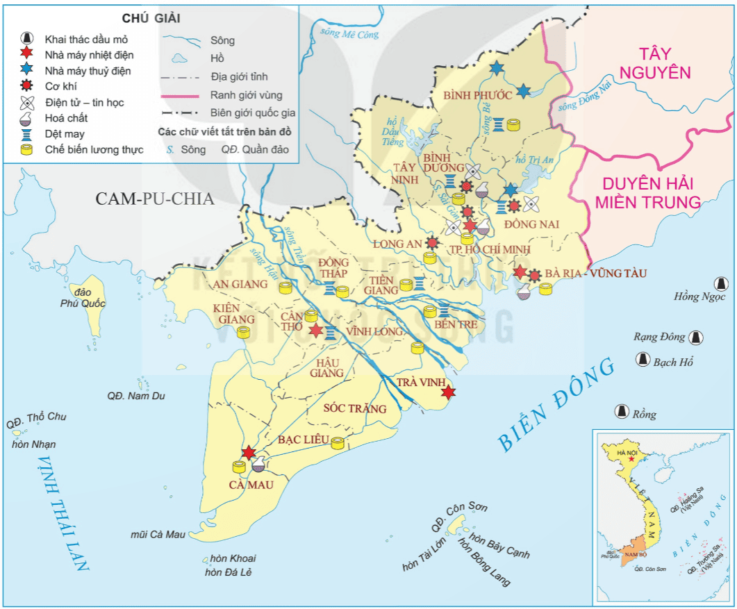 Quan sát Lược đồ công nghiệp vùng Nam Bộ năm 2020, xác định sự phân bố của một số ngành công nghiệp chính ở vùng Nam Bộ. Xếp đúng: