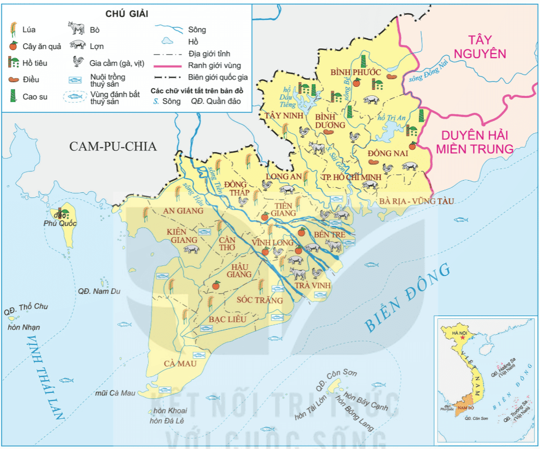 Quan sát Lược đồ nông nghiệp vùng Nam Bộ năm 2020, cho biết các loại cây trồng tập trung nhiều ở khu vực nào? Nối đúng: