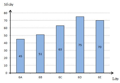 Lớp 6D trồng nhiều nhất được 75 cây, lớp 6A trồng ít nhất được 45 cây