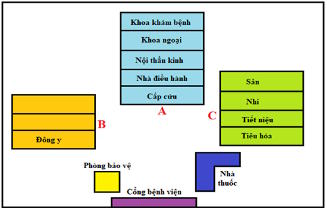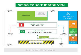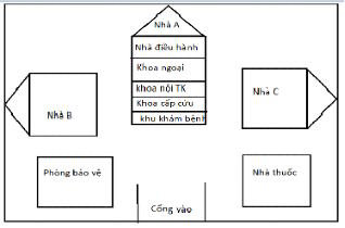 “Bệnh viện gồm: Phòng bảo vệ ở bên trái cổng vào, bên phải cổng vào là nhà thuốc bệnh viện, thằng cổng vào là khu nhà A (có 5 tầng) gồm khoa cấp cứu, nhà điều hành, khoa Nội thần kinh, khoa Ngoại, khu khám bệnh. Bên trái nhà A là nhà B (có 3 tầng) là khoa Đông y, đối diện nhà B và bên phải nhà A là nhà C (có 4 tầng) có các khoa Tiêu hóa, Tiết niệu, Nhi, Sån".
