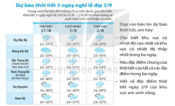Cuối tuần, lớp em dự định tổ chức đi dã ngoại một ngày. Đài khí tượng thuỷ văn có dự báo thời tiết ngày hôm đó như sau: nhiệt độ thấp nhất là 15°C, nhiệt độ cao nhất là 23°C; sáng sớm có sương mù, trời lạnh; trưa chiều hửng nắng, có lúc có mưEm cần chuẩn bị những gì để phù hợp với thời tiết của buổi dã ngoại đó?