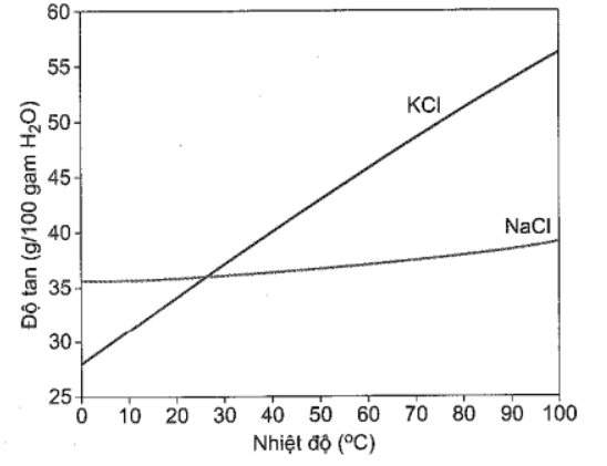 b. đúng; do độ tan của KCl thay đổi mạnh khi thay đổi nhiệt độ so với độ tan của NaCl (2 đồ thị có độ dốc khác nhau rất lớn) nên có thể tách KCl bằng phương pháp kết tinh.