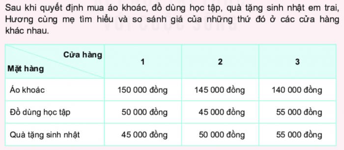 Quan sát bảng giá và giúp Hương lựa chọn cửa hàng mua đồ dùng học tập với giá hợp lí nhất?