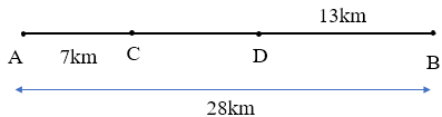 Xem hình vẽ sau: Một xe ô tô đi từ A đến B qua C và D. Biết quãng đường AB dài 28km. Độ dài quãng đường CD là: