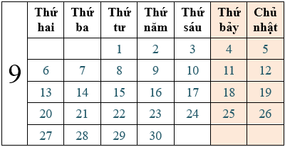 Điền vào chỗ trống: Tờ lịch trên cho biết tháng 9