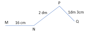 Trang vẽ đường gấp khúc MNPQ. Biết MN dài 16 cm, NP dài 2dm, PQ dài 1dm 3cm. Tính độ dài đường gấp khúc MNPQ?