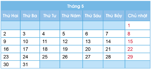 Xem tờ lịch và cho biết: Ngày cuối cùng của tháng 5 là thứ mấy?