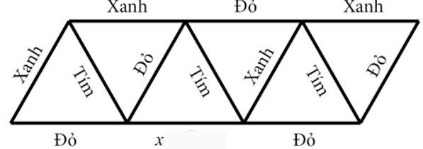 Hình dưới đây mô tả màu sắc của một số đoạn thẳng. Bạn An muốn tô màu các đoạn thẳng còn lại bằng một trong 3 màu đỏ, xanh và tím sao cho 3 cạnh của mỗi tam giác là 3 màu khác nhau. Hỏi màu cần tô cho đoạn thẳng đánh dấu x là màu gì