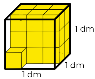 Quan sát hình vẽ, ta thấy hình lập phương lớn cạnh 1 dm được xếp đầy bởi 27 hình lập phương nhỏ màu vàng.