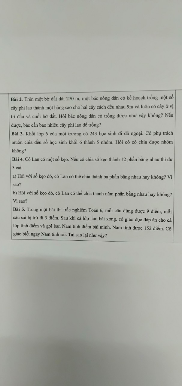 thành một hàng sao cho 2 cây cách 9m và luôn có cây ở vị trí đầu và cuối bờ đất. Hỏi bác nông dân có trồng được như vây không ? Nếu được , bác cần bao nhiêu cây phi lao để trồng?