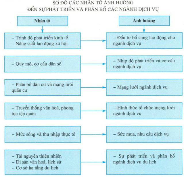 Dựa vào sơ đồ trên, em hãy trình bày những nhân tố ảnh hưởng đến sự phát triển và phân bố của ngành dịch vụ?
