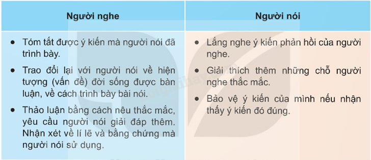 a. Mở đầu Nêu hiện tượng (vấn đề) cần bàn luận một cách gọn, rõ. Thu hút sự chú ý của người nghe bằng cách dùng câu chuyện để giới thiệu hiện tượng (vấn đề) b. Triển khai - Lần lượt trình bày các ý theo nội dung đã chuẩn bị. Khi nói, cần sử dụng lí lẽ và bằng chứng. - Nhấn mạnh ý kiến riêng của bản thân. c. Kết luận - Tóm lược nội dung đã trình bày. - Gợi suy nghĩ và kích thích sự đối thoại của người nghe. Chú ý: - Điều chỉnh giọng nói và tốc độ nói phù hợp (không nói to hay nhỏ quá; không nói nhanh hay chậm quá; lên giọng, xuống giọng ở những chỗ cần thiết). - Giọng nói truyền cảm; cách nói nghiêm túc nhưng vui vẻ. - Ánh mắt, nét mặt, cử chỉ, điệu bộ phù hợp, thể hiện sự tương tác với người nghe. |