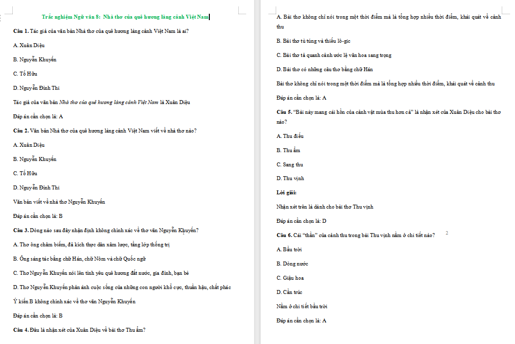 Trắc nghiệm Ngữ văn 8 Bài 8: Nhà thơ của quê hương làng cảnh Việt Nam