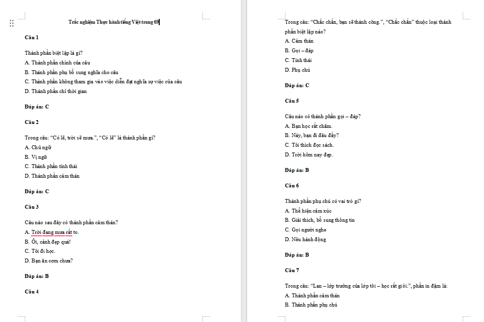 Trắc nghiệm Ngữ văn 8 Bài 8: Thực hành tiếng Việt trang 69