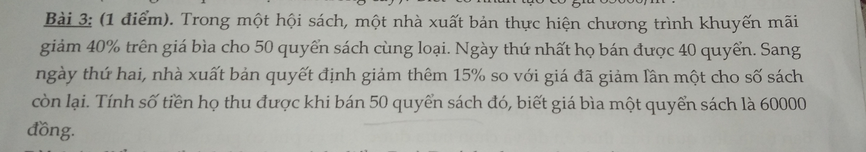 Trong một hộ sách, nhà xuất bản thực hiện chương trình khuyến mãi giảm 40% trên giá bìa cho 50 quyển sách