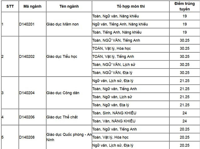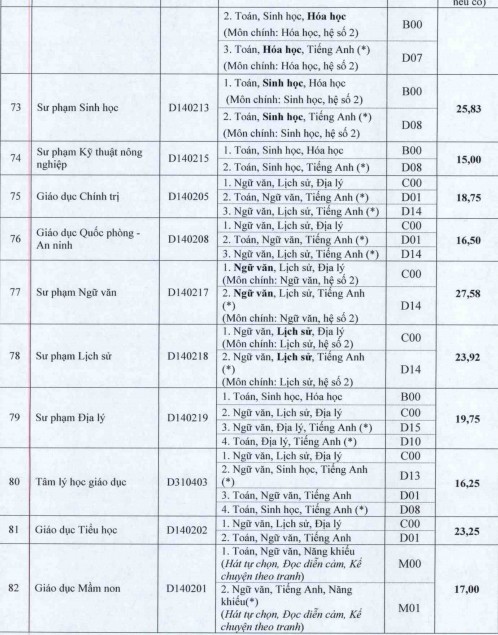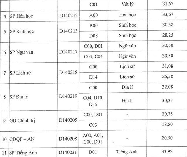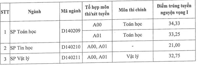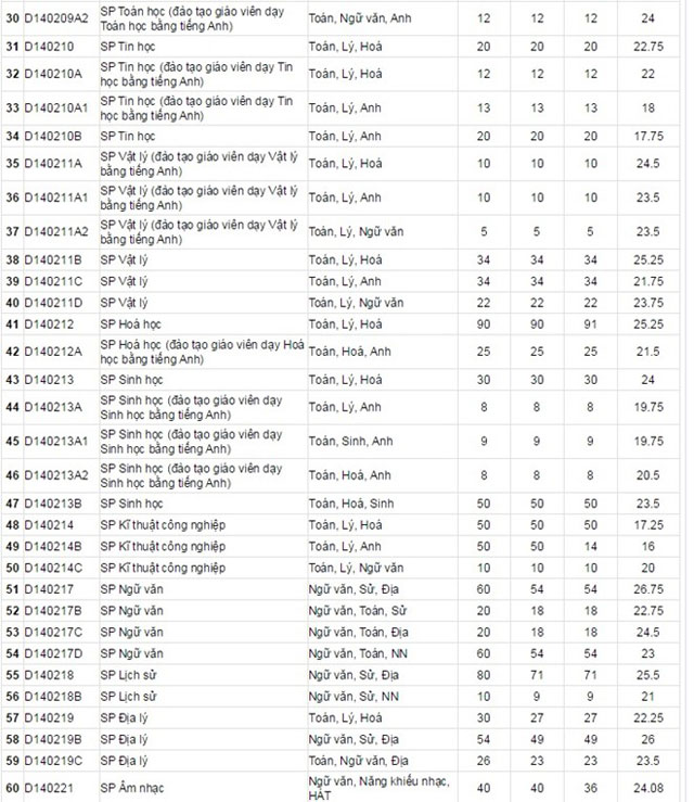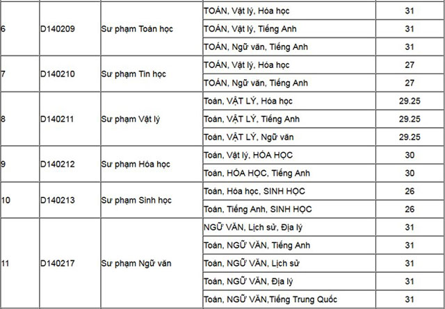Đại học Sư phạm Hà Nội có ngành cao nhất là là Sư phạm toán (khối A) lấy 25,75 điểm. Giáo dục tiểu học (toán-ngữ văn-địa) lấy 26,26 điểm. Ngành lấy điểm thấp nhất là ngành Sư phạm kỹ thuật công nghiệp (khối A1) lấy 16 điểm. Các ngành khác chủ yếu lấy mức 20 điểm trở lên.