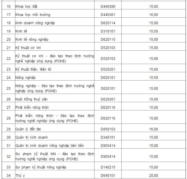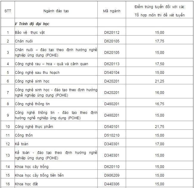 Học viện Nông nghiệp Việt Nam đã thông báo điểm trúng tuyển vào đại học, cao đẳng đợt 1 năm 2015 đối với học sinh phổ thông, khu vực 3 như sau: