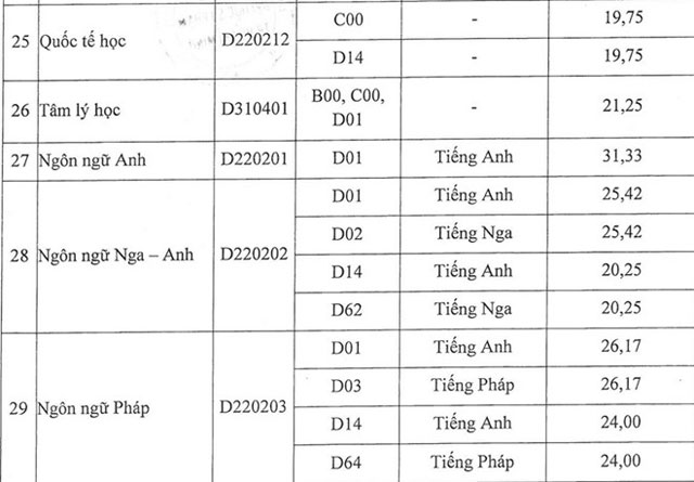 Học viện Ngoại giao Việt Nam công bố điểm trúng tuyển NV1 vào trường. Ngành có điểm chuẩn cao nhất là Ngôn ngữ Anh với 32 điểm. Các ngành còn lại điểm chuẩn dao động 23 đến 24,5 điểm.