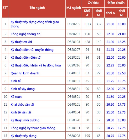 Đại học Giao thông Vận tải công bố điểm chuẩn: