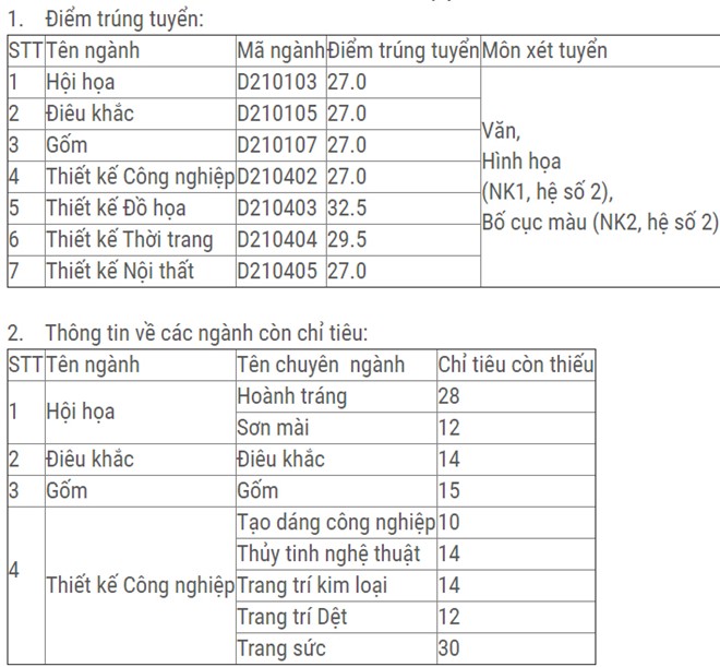 Hội đồng tuyển sinh Đại học Mỹ thuật Công nghiệp thông báo điểm trúng tuyển nguyện vọng 1 (mức điểm cho thí sinh thuộc khu vực 3 và không thuộc diện ưu tiên chính sách).