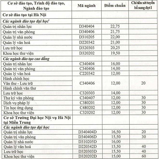 Đại học Nội vụ Hà Nội thông báo điểm trúng tuyển nguyện vọng 1. Theo đó, điểm chuẩn cao nhất là 22,75 điểm, ngành Quản trị nhân lực.