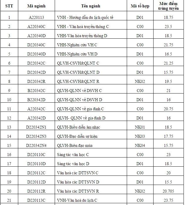 Đại học Văn hóa Hà Nội thông báo điểm trúng tuyển, danh sách trúng tuyển nguyện vọng đợt 1 và chỉ tiêu, điều kiện xét nguyện vọng bổ sung lần 1.