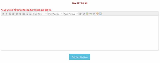 +Sau khi nộp phiếu dự thi, NHÓM TRƯỞNG cần nhập tóm tắt cho dự án/đề tài. Tóm tắt dự án bị giới hạn số kí tự tùy thuộc vào quy chế của cuộc thi.