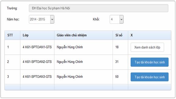 Giáo viên có quyền “Tạo tài khoản học sinh”. Hệ thống sẽ tự động sinh ra tài khoản sau khi giáo viên ấn nút. Giáo viên có thể “Xem danh sách lớp” và download danh sách lớp (ở cuối bảng danh sách lớp), trong đó bao gồm thông tin về tài khoản và mật khẩu đã cấp cho học sinh.Đồng thời, giáo viên cũng có thể theo dõi quá trình khai báo thông tin của từng học sinh.