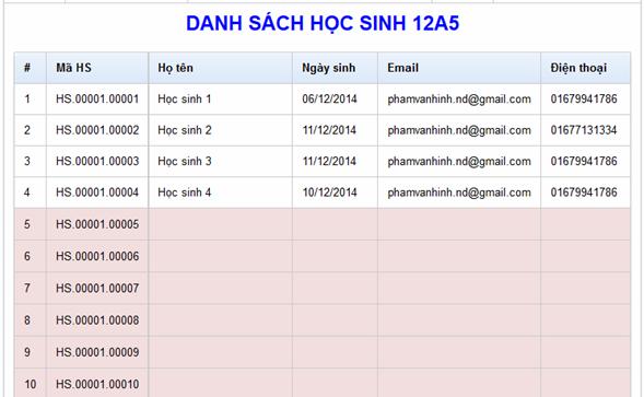 Ghi chú: Thông tin của mỗi học sinh sẽ hiển thị lên bảng danh sách lớp sau khi học sinh đăng nhập vào hệ thống và khai báo thông tin cá nhân, do đó, giáo viên không cần phải khai báo thông tin cho từng học sinh trong lớp của mình.
