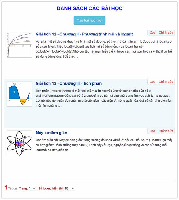 Module “Quản lí bài học” cho phép giáo viên tạo một bài học hoặc chủ đề mới; chỉnh sửa lại bài học; xóa bài học; quản lí danh sách các bài học.