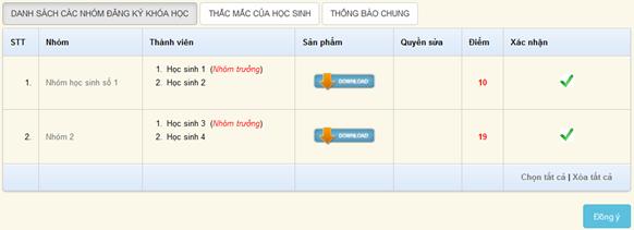 Đối với từng bài học, giáo viên có thể theo dõi quá trình đăng kí học của học sinh, của từng nhóm học sinh trong mục “Nhóm HS – sản phẩm”.
