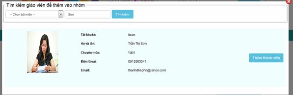 +Sau khi tìm kiếm, danh sách các giáo viên thỏa mãn điều kiện tìm kiếm sẽ hiện ra. Lựa chọn và ấn nút “Thêm thành viên” tương ứng với mỗi giáo viên để thêm vào nhóm.