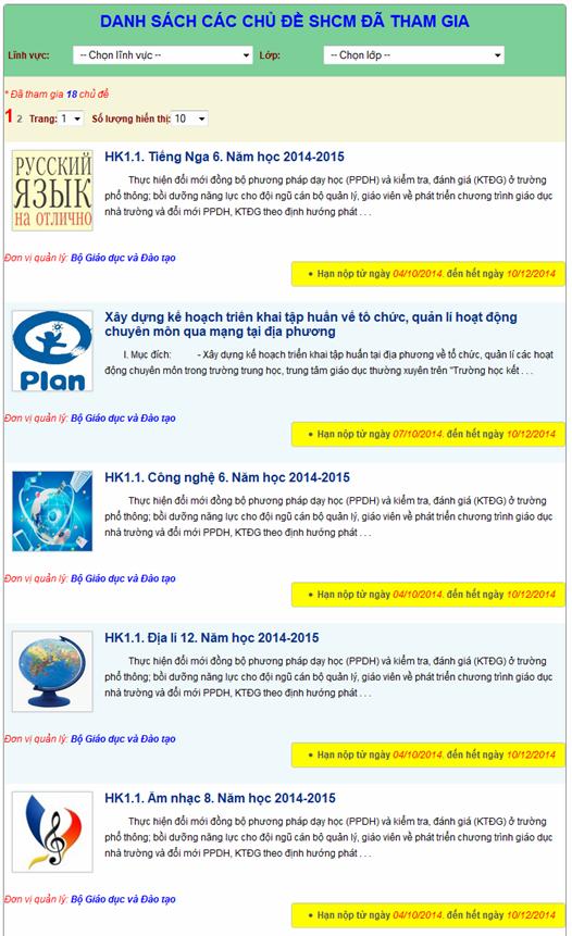 Danh sách các chủ đề mà giáo viên đã tham gia sẽ hiện lên như hình dưới đây.