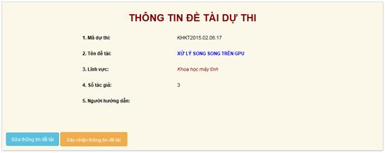 Lưuý: đây là bước xác nhận của Các tác giả đề tài với Sở GD&ĐT. Sau khi xác nhận, toàn bộ các quy trình trước đó sẽ KHÔNG THỂ sửa chữa được nữa. Nếu sau khi xác nhận, các tác giả của đề tài phát hiện ra sai sót cần chỉnh sửa thì buộc phải liên hệ với Sở GD&ĐT để mở quyền chỉnh sửa các thông tin đăng kí dự thi.