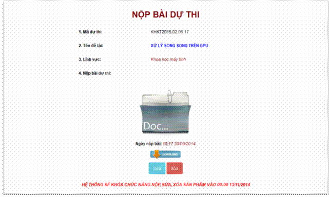 +Sau khi nộp sản phẩm, các tác giả của đề tài có thể tải lại file sản phẩm xuống để kiểm tra lại bằng cách chọn nút